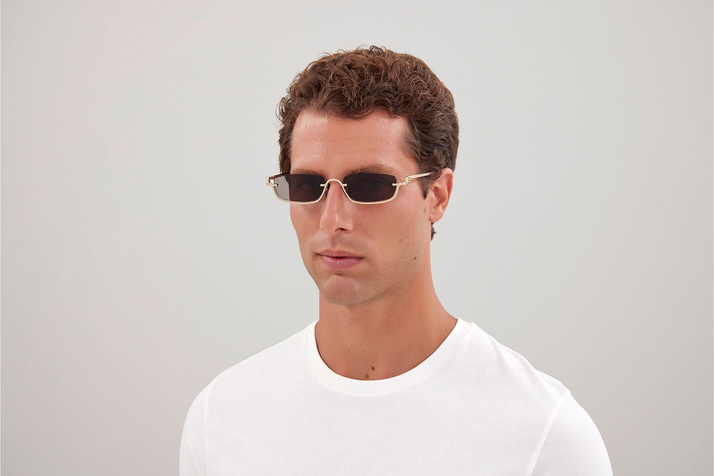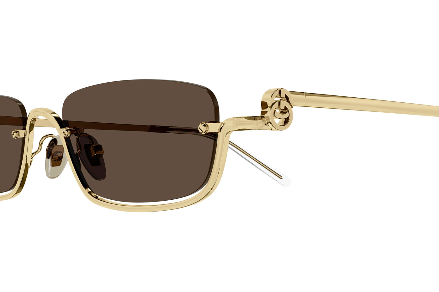 A super narrow rectangular shape with half rim construction, the GG1278S sunglasses from Gucci are a distinct frame capable of elevating your look. Featuring an upside down iconic interlocking logo on both temples.