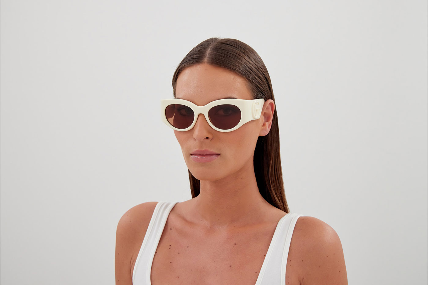 An inspired concept from Gucci, paying homage to the 80’s. This style features an oval shape in acetate. Finished with the Gucci double G logo embossed on the temples.