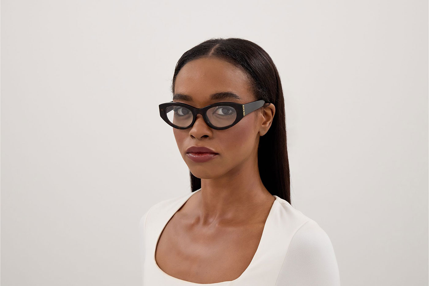 The GG2041O embodies refined elegance with its soft cat eye silhouette, crafted in luxurious acetate for a bold yet sophisticated presence. The frame’s generous thickness highlights Gucci’s iconic metal logo on the side, creating a signature detail that catches the eye with understated confidence, making it a chic statement for the modern wearer.