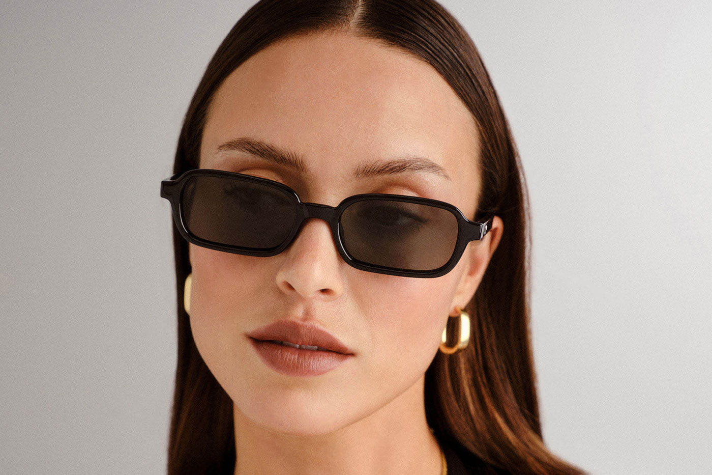 This seasons must have, the Pilferer sunglasses by Le Specs offer narrow proportions and a slim line rectangular frame design. Completed with discreet Le Specs metal stud detailing on both temples for that elegant touch.